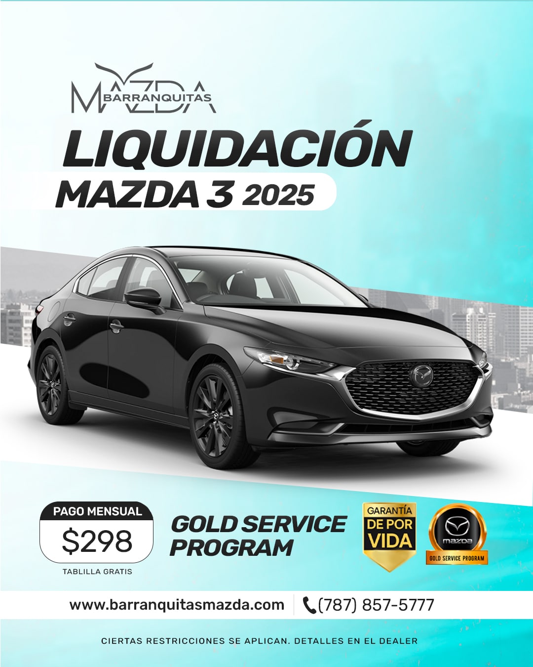 (3) Mazda3 HB 2025 color negra y número de STOCK 773421 con precio de venta $29,995, requiere pronto de $9,500 aportados por el cliente para balance a financiar de $20,495, 84 pagos de $298 al 5.94% APR.