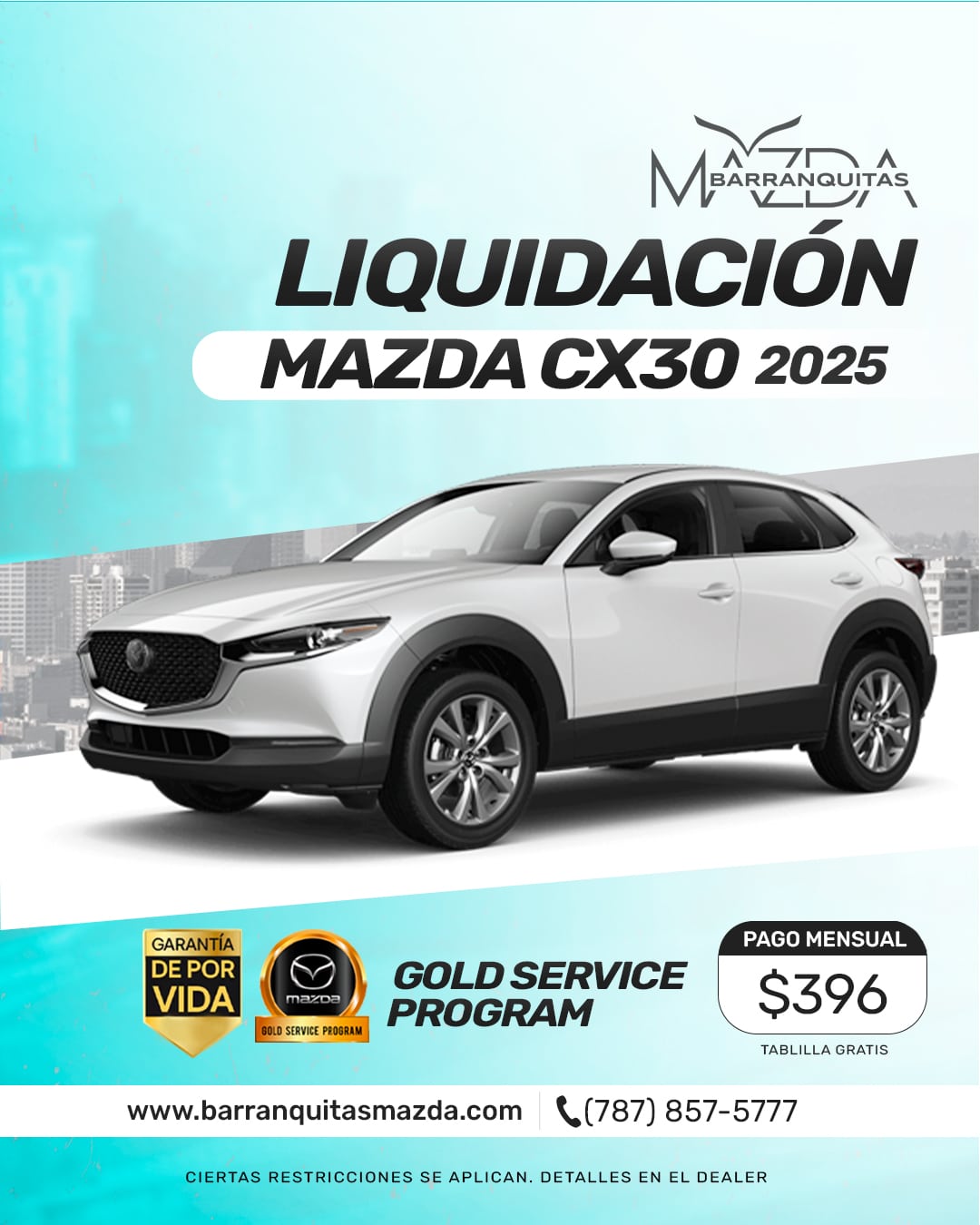 (1) Mazda CX-30 2025 color blanca y número de STOCK 793761 con precio de venta $34,995, bono de $1,000, requiere pronto de $7,000 aportados por el cliente para balance a financiar de $26,995, 84 pagos de $396 al 6.19% APR con débito directo.