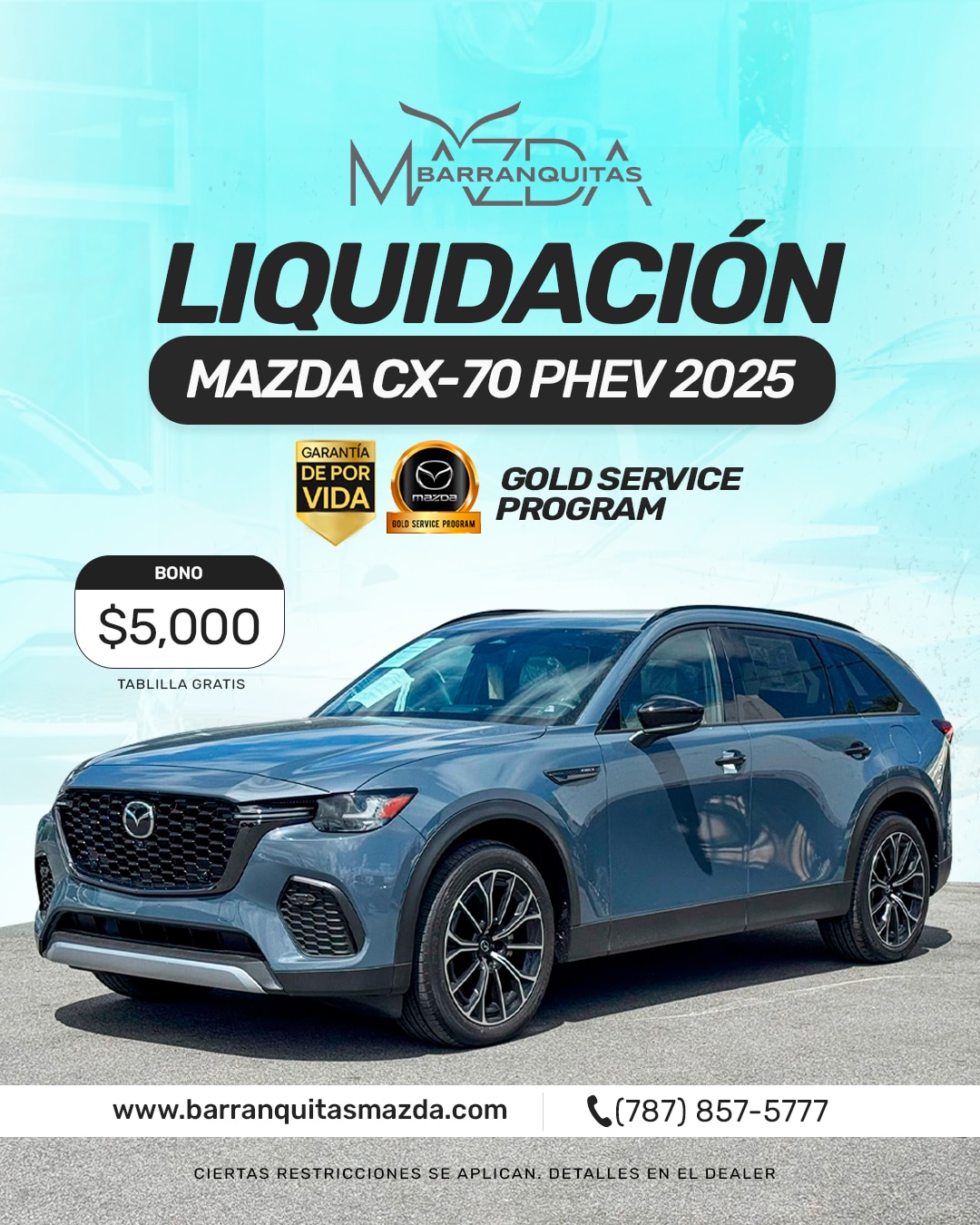 (5) Mazda CX-70 PHEV 2025 número de STOCK 122828 con precio de venta de $64,995, bono de $5,000.